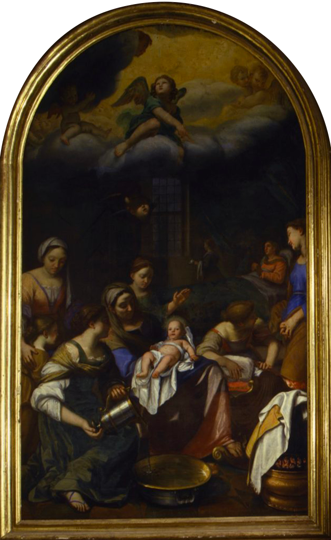 The painting is dated to the 1660s and was commissioned by Anna Maria Mazzarino, sister of the powerful cardinal and abbess of the monastery of Santa Maria in Campo Marzio. The scene takes place in an interior, with the figures arranged on different levels. In the foreground is the midwife surrounded by various other helpers, Saint Anne and the newborn Virgin. In the background to the right is the bed with the parturient, assisted by handmaids, surmounted by a large open drape as a backdrop. In the upper part is the divine participation in the scene, with an angel in the center, seated on clouds and surrounded by seraphim.